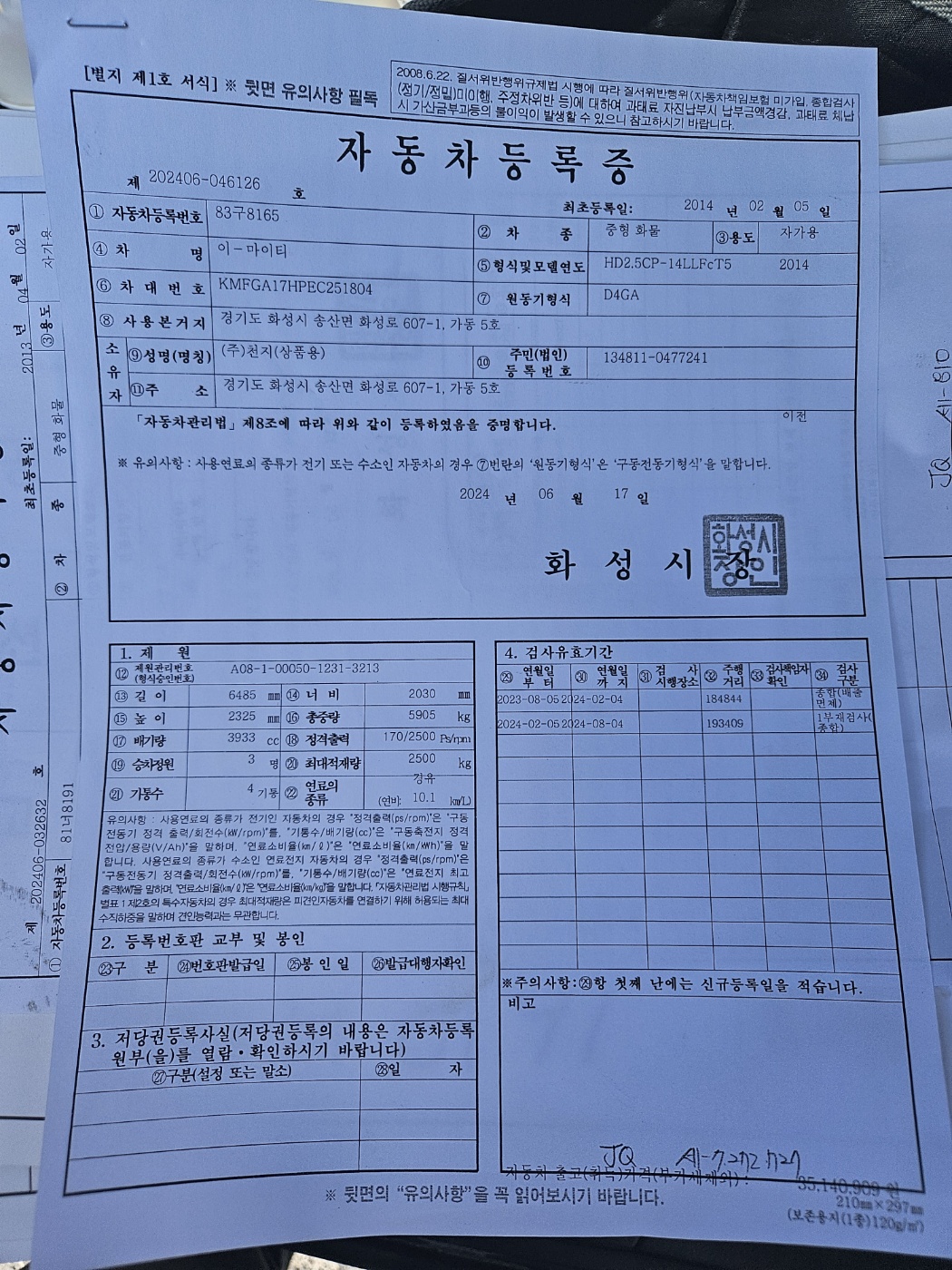 상호 : (주) 천지 / 대표 : 임광수 / 주소 : 경기도 화성시 송산면 화성로 607-1 / 사업자등록번호 : 232-81-04733 /개인정보책임자:조영래 (자동차매매사원증:GC24-04366(주)천지)